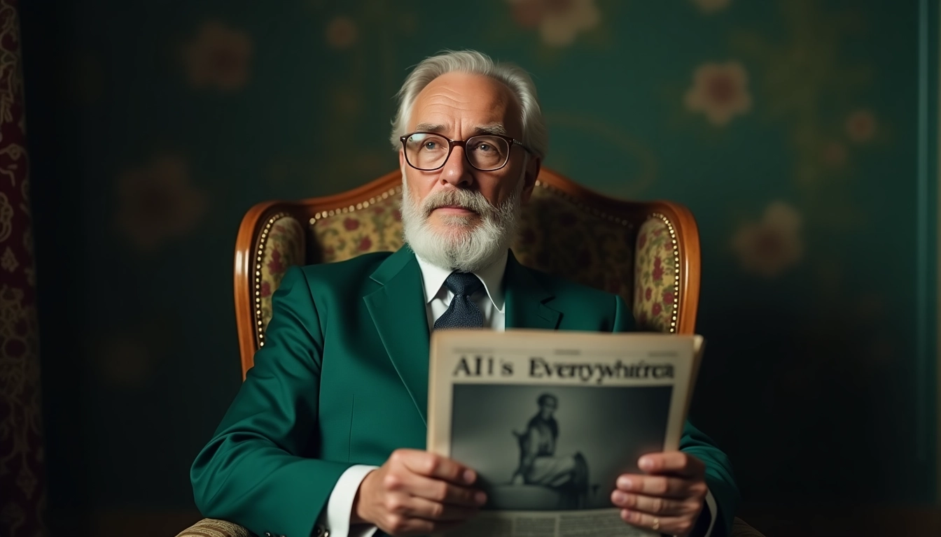 Prompt: A contemplative portrait of an elderly man sitting in a vintage chair, gazing thoughtfully into the void. He is dressed in a stylish green suit that exudes a sense of sophistication, complemented by a well-groomed, distinguished beard. In his hands, he holds a newspaper titled 'AI is Everywhere' on the cover page. The background is softly blurred, creating a dreamlike atmosphere that emphasizes the man's expression and the weight of his thoughts.